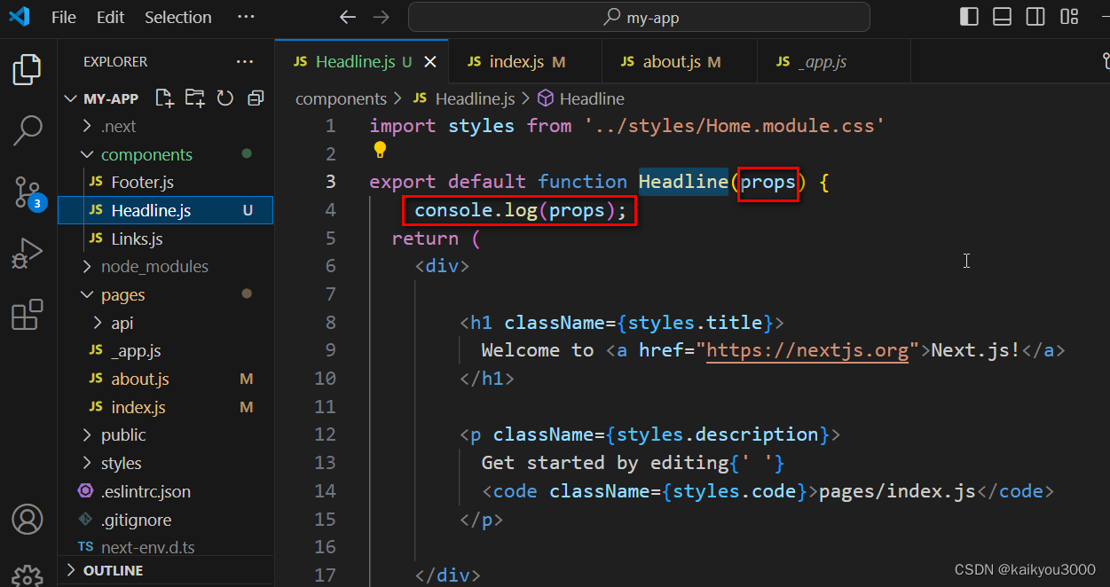 ③在Headline.js组件的函数中传入参数,并在浏览器中打印出来