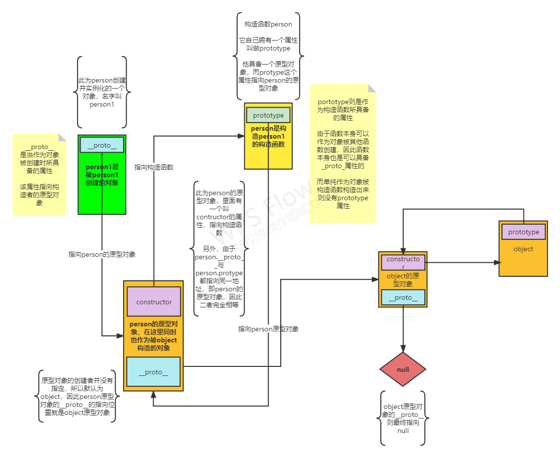 如上图所示我们可知,被创建的对象的__proto__指向的是构造函数的原型对象,而原型对象自然也具有自己的创建者,即object原型对象,因此它的__proto__指向的是object原型对象,而object原型对象的__proto__一定指向的是null