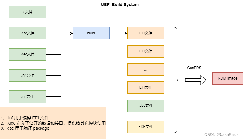 通常在进行编译时, FDF 文件 和 DSC 文件位于同一级目录,DSC 中描述中编译各个EFI 文件,之后通过Tools 生成 FD images.