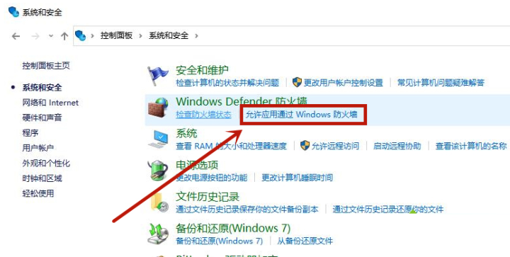 4、然后我们要在系统防火墙内进行相应设置,点击允许应用通过Windows防火墙。