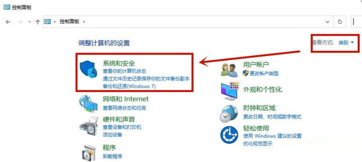 3、然后在控制面板把查看方式调整为类别,再进入系统和安全内。