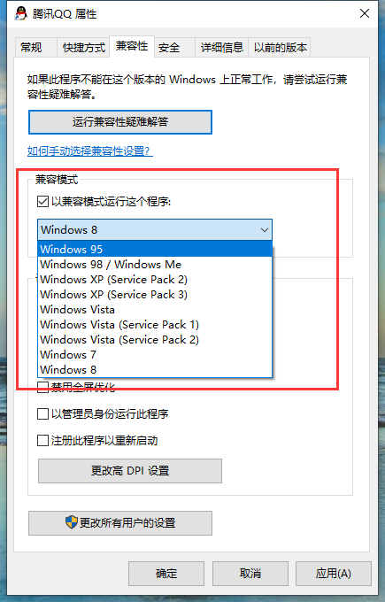 5、在属性窗口中勾选以兼容模式运行这个程序,然后在下面的列表中选择较老的系统版本去运行这个应用程序。