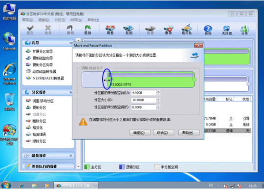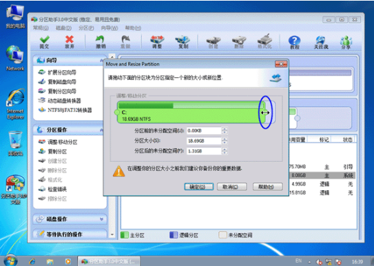 5、然后我们就可以在分区调整界面进行C盘大小的调整,我们鼠标移动到C分区的右边,向右拖动右边的手柄来扩大C盘的大小,一直到20GB即可。