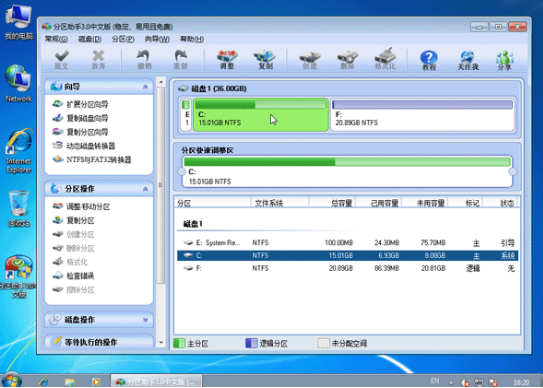 1、点击打开分区助手进入主页面,在这可以看到电脑磁盘的大小,可以在图中看出C盘的大小为15.01GB,F分区的大小为20.89GB。