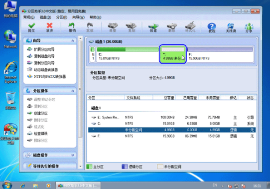3、缩小完成之后,点击确定就可以返回到分区助手专业版软件的主页面,我们这时就可以看到F分区已经变成15.90GB大小,同时我们在C分区后方可以看到有4.99GB分配的空间。