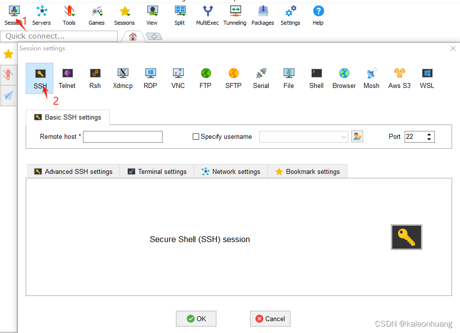 MobaXterm运行添加SSH连接非常简单,选择session---->SSH,录入主机地址和端口即可。