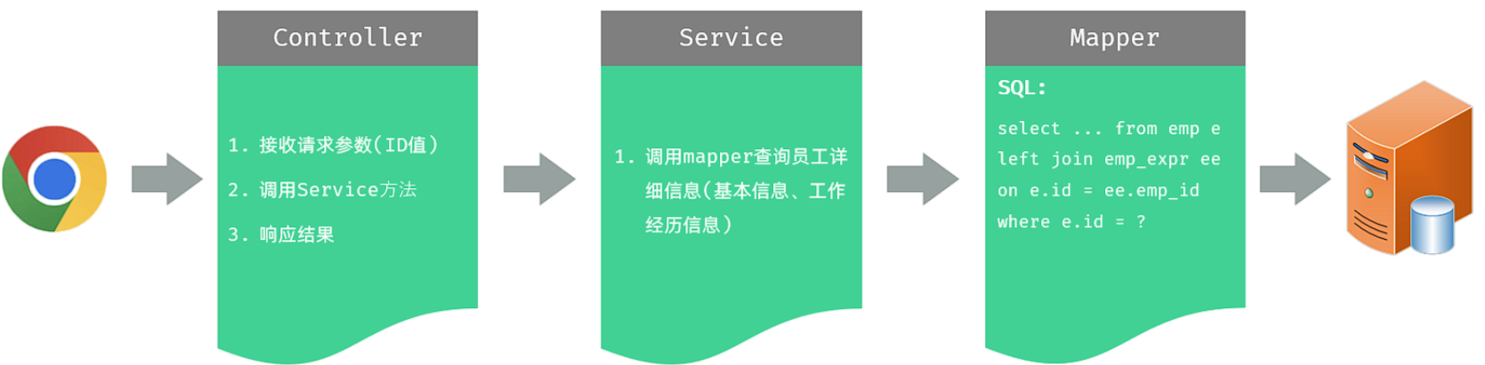 Controller层:负责接收前端发起的请求,参数为员工信息和工作经历信息,并调用Service分页查询部门数据,然后响应数据。