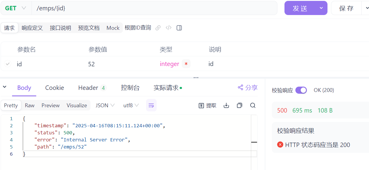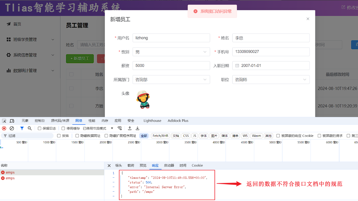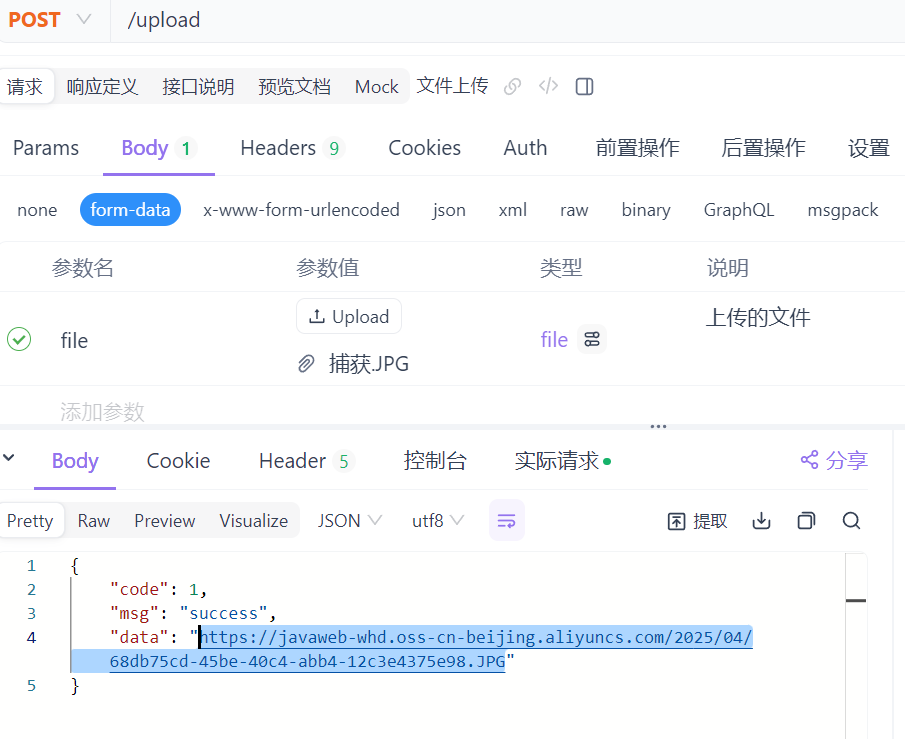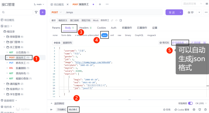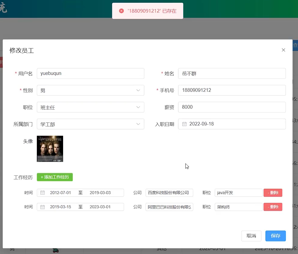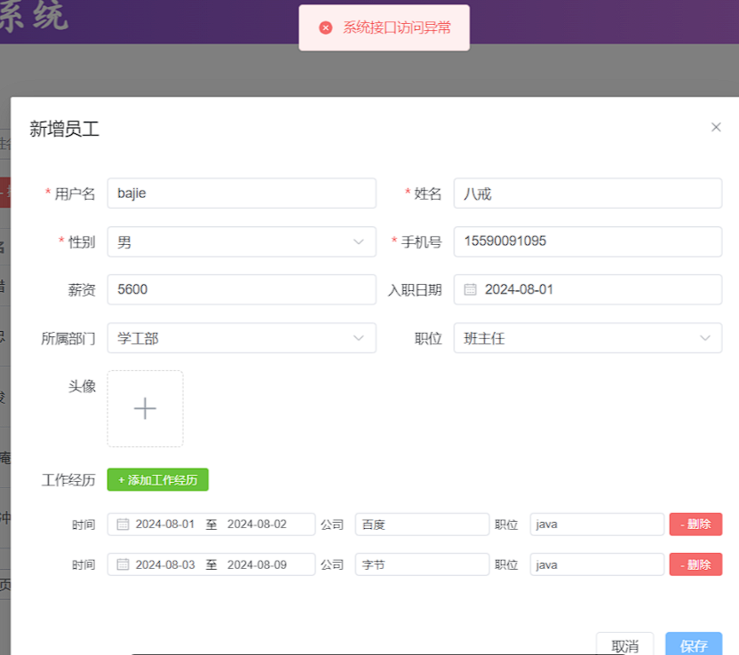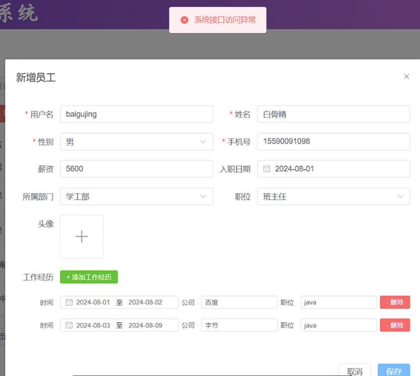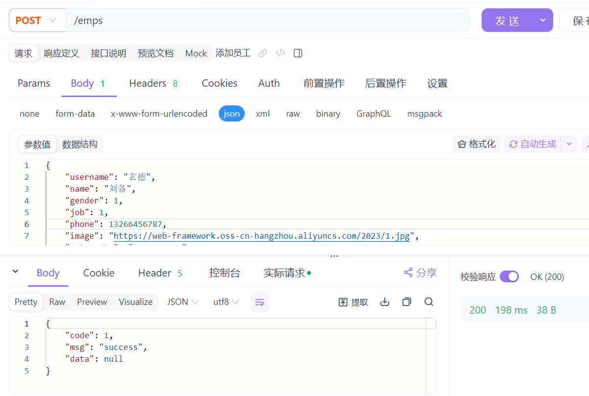 { "image": "https://web-framework.oss-cn-hangzhou.aliyuncs.com/2022-09-03-07-37-38222.jpg", "username": "孟德", "name": "曹操", "gender": 1, "job": 1, "entryDate": "2022-09-18", "deptId": 1, "phone": "18809091234", "salary": 80000, "exprList": [ { "company": "强汉股份有限公司", "job": "java开发", "begin": "2012-07-01", "end": "2019-03-03" }, { "company": "曹魏股份有限公司", "job": "架构师", "begin": "2019-03-15", "end": "2023-03-01" } ] }- 响应数据样例:
