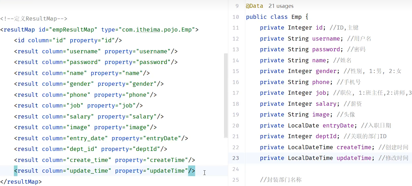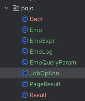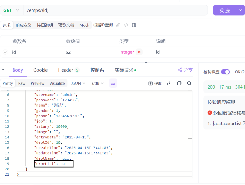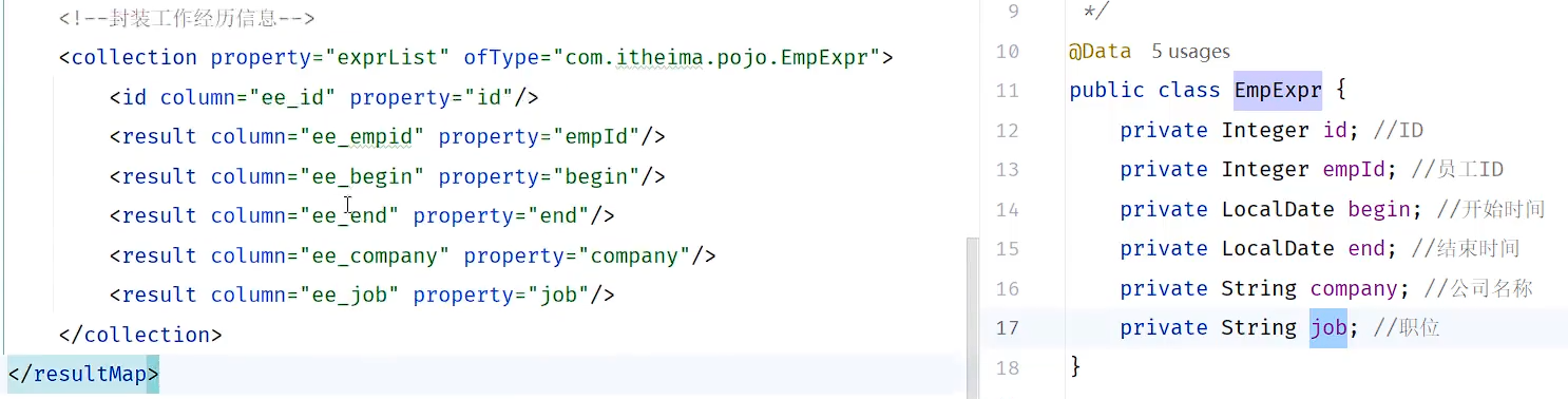 请求参数有工作经历的列表,所以我们需要在Emp员工实体类中增加属性exprList来封装工作经历数据。 最终完整代码如下: