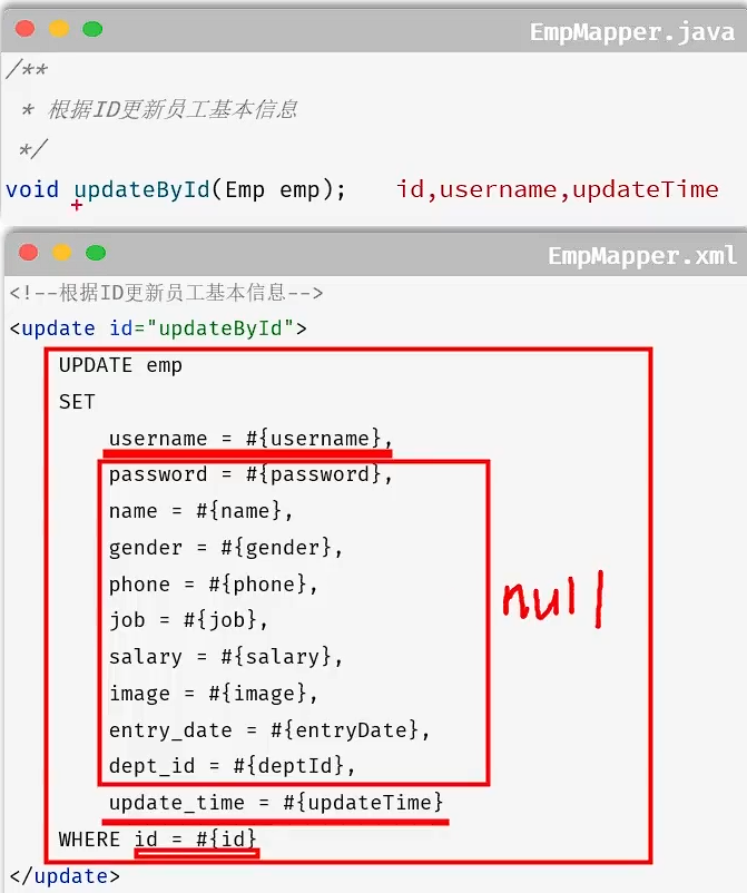 @Insert("insert into emp(username, name, gender, phone, job, salary, image, entry_date, dept_id, create_time, update_time) " +