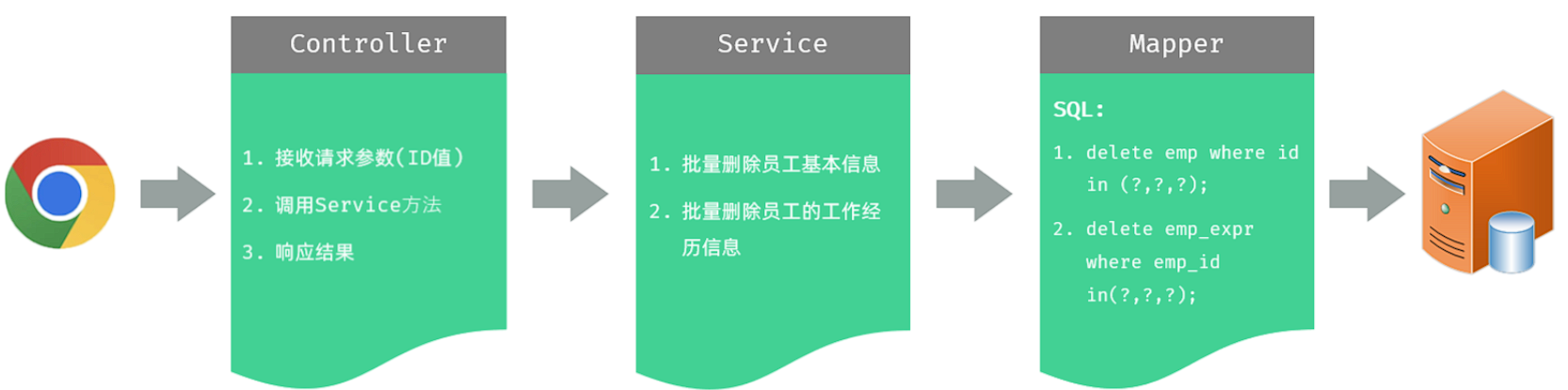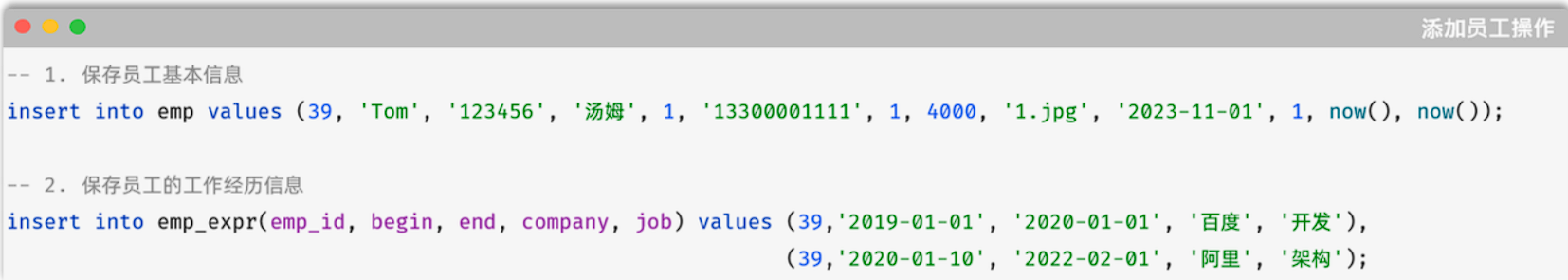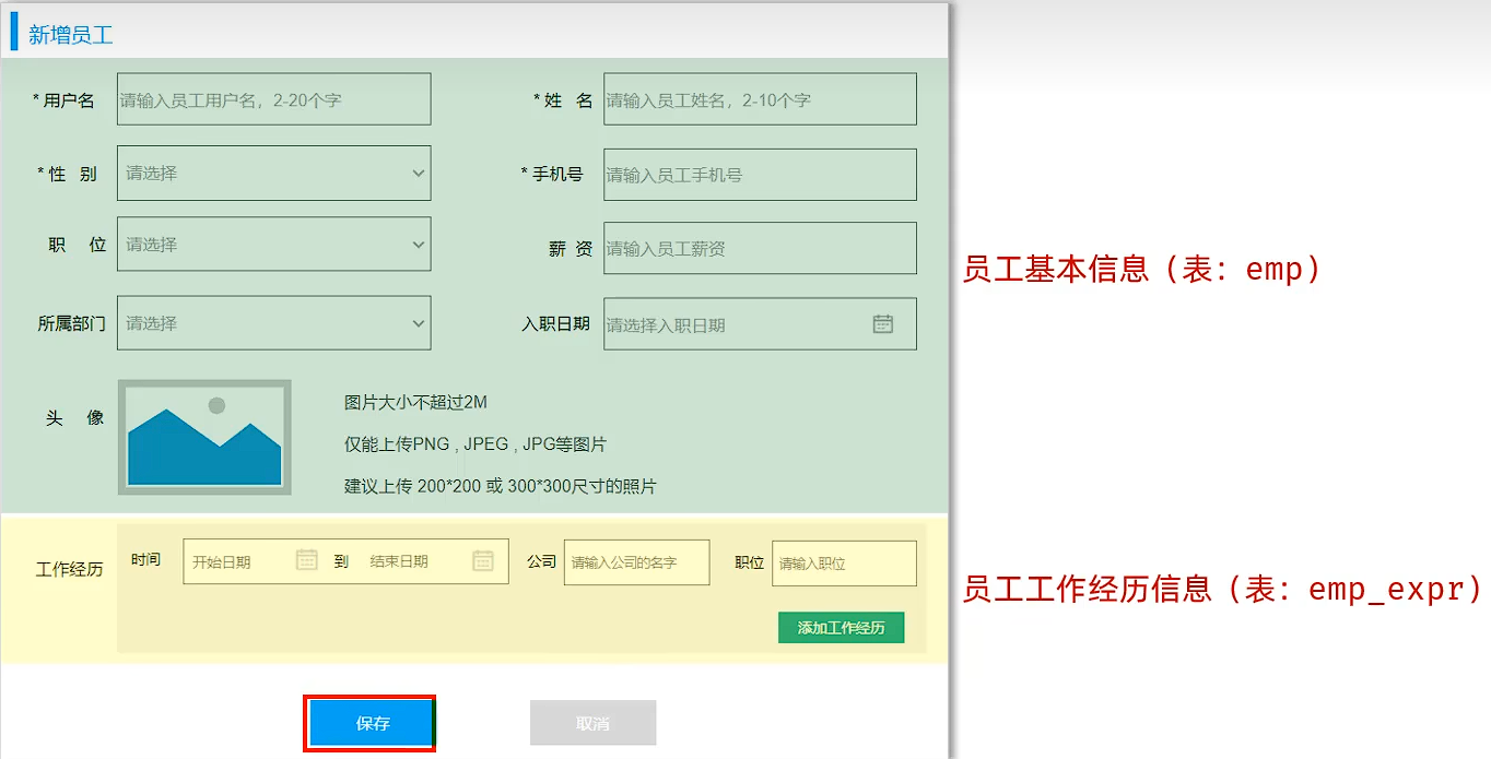 在新增员工的时候,在表单中,我们既要录入员工的基本信息,又要录入员工的工作经历信息。 员工基本信息,对应的表结构是emp表,员工工作经历信息,对应的表结构是emp_expr 表,所以这里我们要操作两张表,往两张表中保存数据。