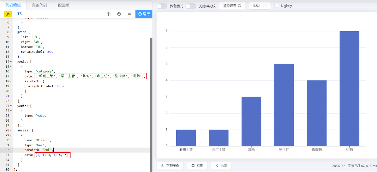 对于这类的图形报表,服务端要做的,就是为其提供数据即可。 我们可以通过官方的示例,看到提供的数据就是一个json格式的数据。