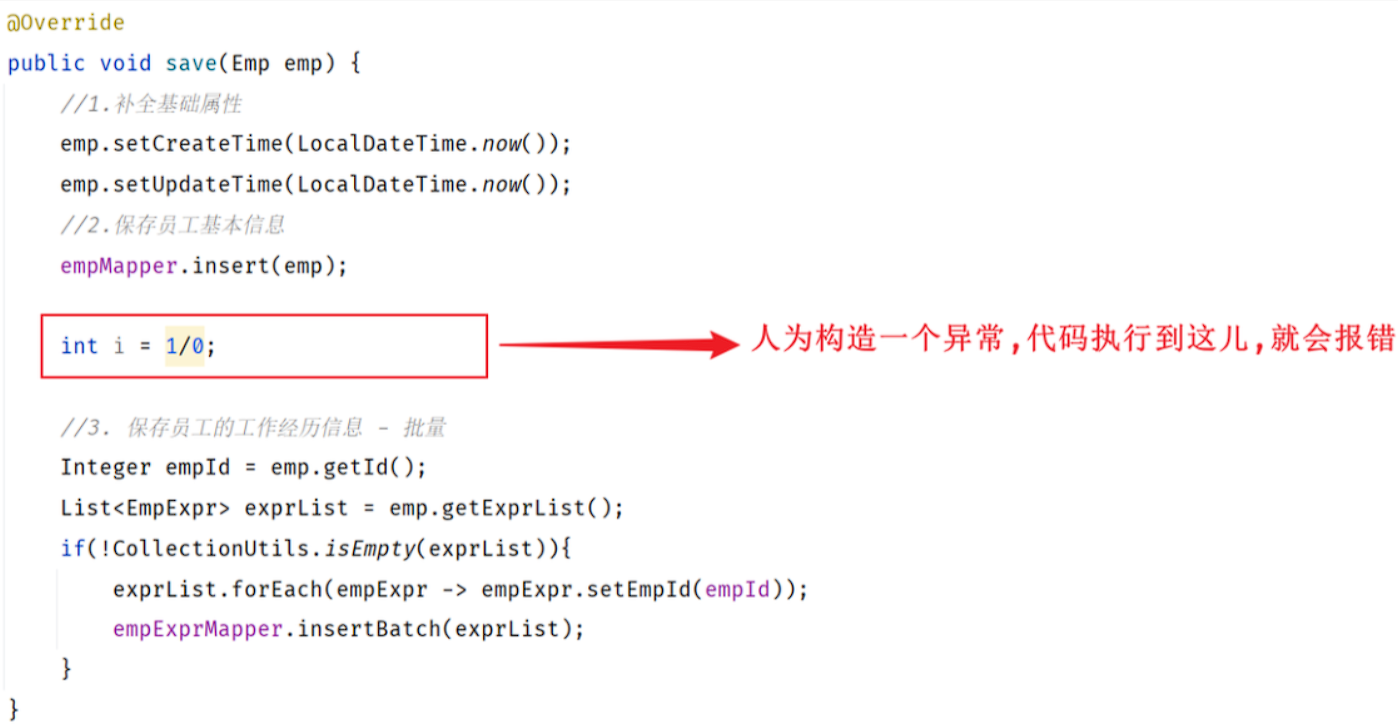 在EmpExprMapper上增加insertBatch方法,目的是批量保存员工工作经历,代码如下: