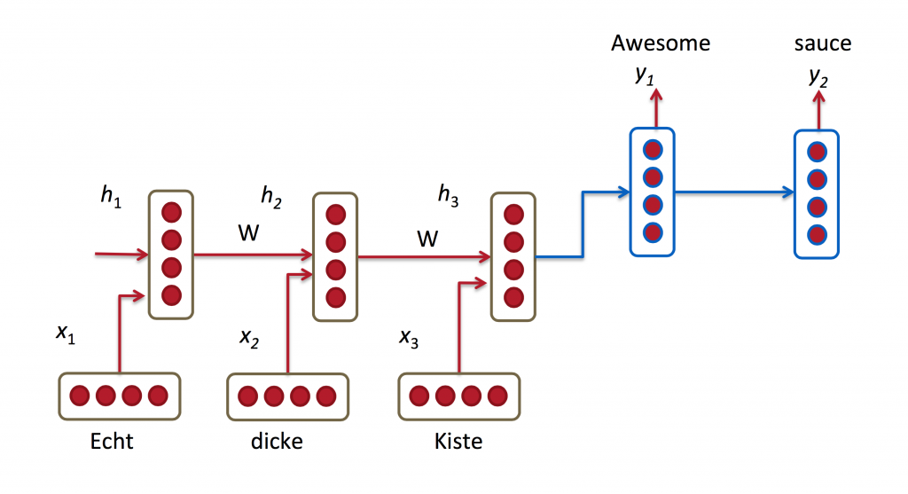 机器翻译类似于语言模型,输入是一个源语言的词序列(例如,德语)。我们想输出一个目标语言的词序列(例如,英语)。关键的区别就是我们的输出只能在我们已经看见整个输入之后开始,因为,我们翻译句子的第一个词可能需要从整个输入句子获取信息。