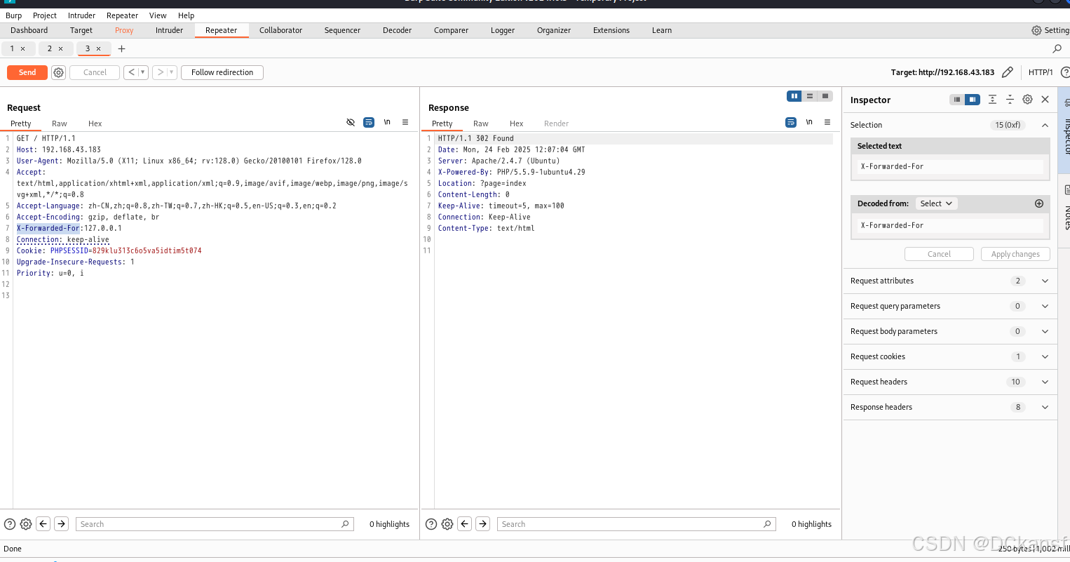 图 2 抓包后,添加X-Forwarded-For:127.0.0.1,变成了302跳转 图
