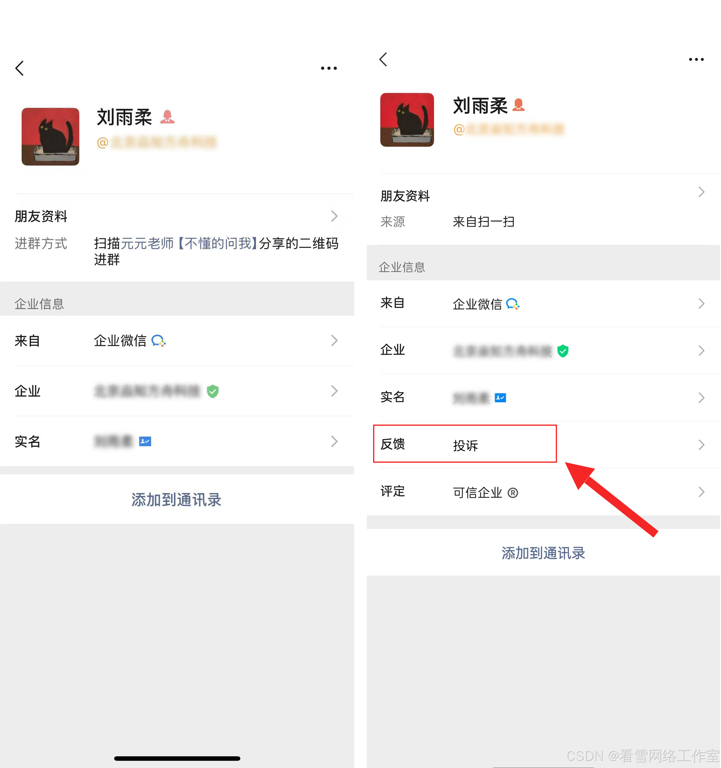 投诉发起方:自动抓取企业微信客户昵称、备注(需开启 “客户信息授权”);