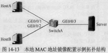 HostA和HostB通过Gigabitethernet0/0/1与Gigabitethernet0/0/2接口接入SwitchA,HostA和HostB同属于VLAN10。监控设备Server直连在SwitchA的Gigabitethernet0/0/3接口上。希望对VLAN10中源或目的MAC地址为0001-0001-0001的入方向流量进行监控。