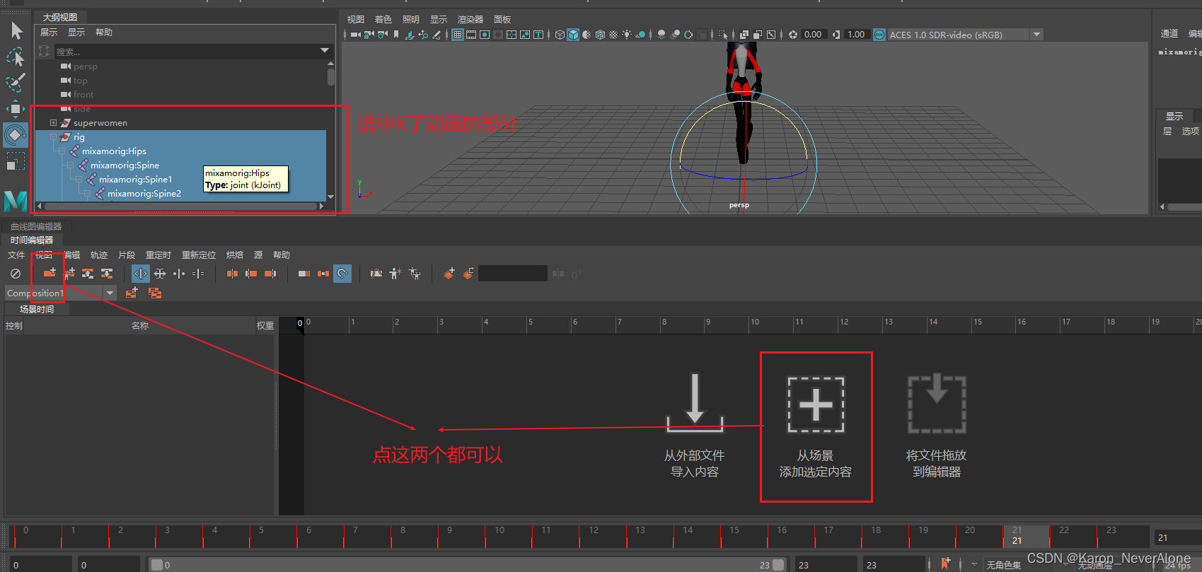接下来用这个方法把其他的动画片段也做成clip ,不需要新建场景,直接导入下一个fbx,maya会自动匹配骨骼,另外记得把时间编辑器里的内容先删掉噢!