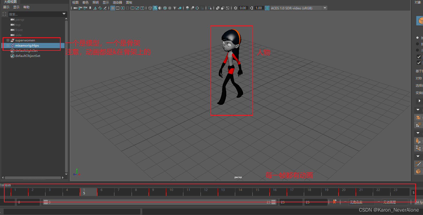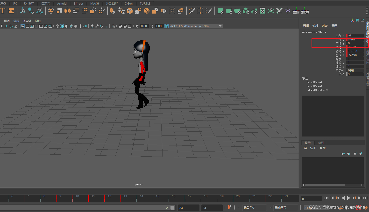 ②进行初步的动作调整,比如说走路,如果后期想做循环走的话,建议把骨骼大组的translate的xyz通道动画给取消了 (直接在对应属性上右键——断开连接即可)