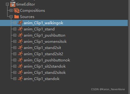 创建好之后,可以发现这两个位置都有了变化,source可以理解为你的个人动作库,你可以随时将任意的动作拉入时间编辑器中进行动作之间的组合、剪辑等等