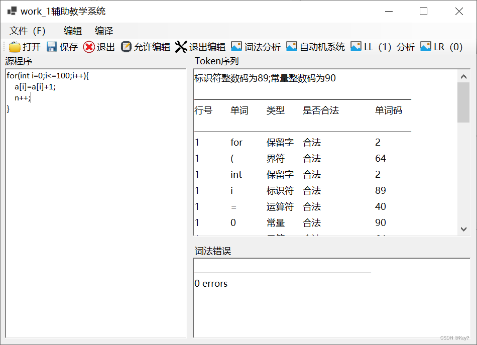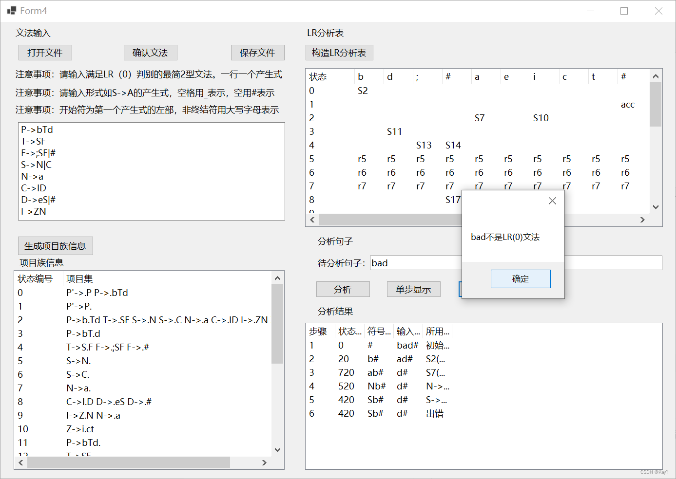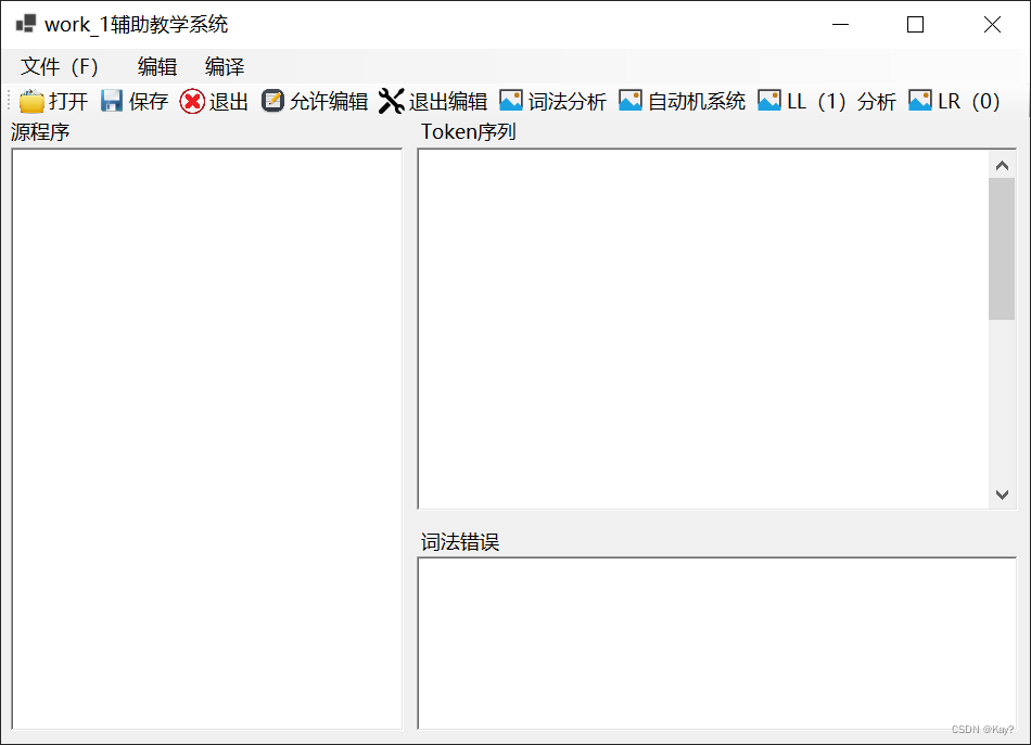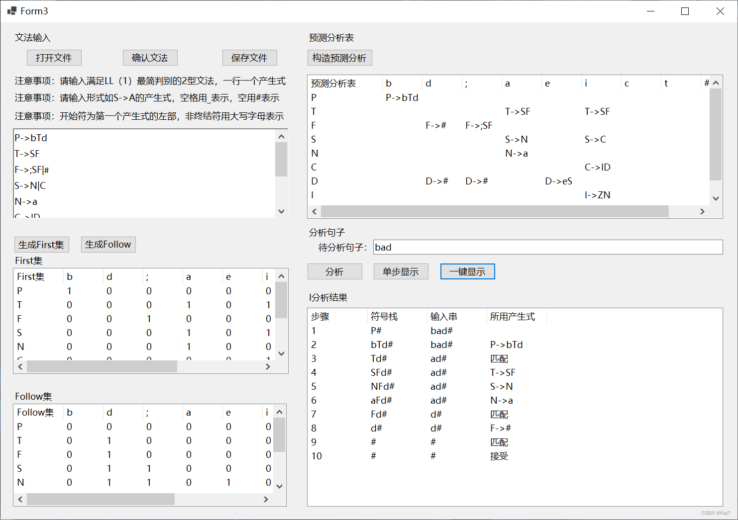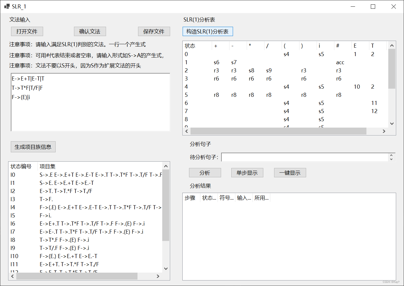 本系统是基于C#开发的一个编译原理实验辅助教学系统,包含了词法分析器设计、自动机系统、NFA_DFA_MFA转换、LL(1)分析、LR(0)分析、SLR(1)分析等主要功能的实现。
