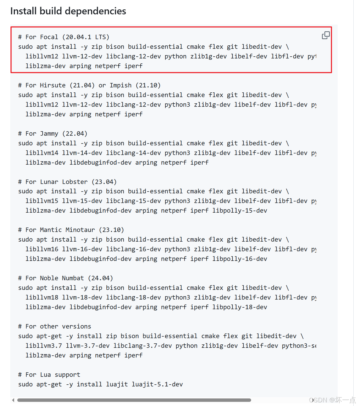 sudo apt install -y zip bison build-essential cmake flex git libedit-dev \ libllvm12 llvm-12-dev libclang-12-dev python zlib1g-dev libelf-dev libfl-dev python3-setuptools \ liblzma-dev arping netperf iperf