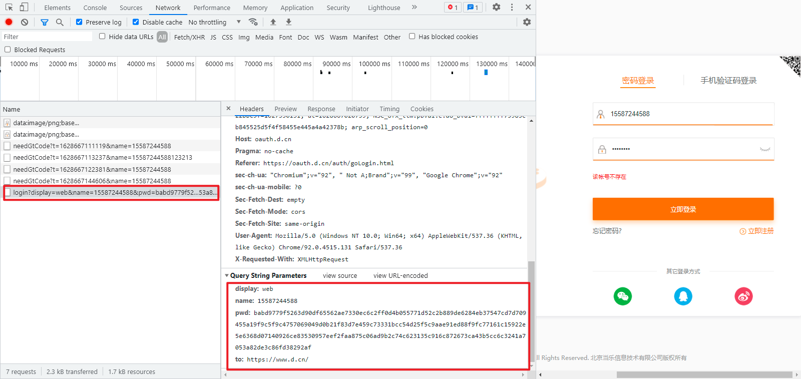 随便输入一个账号密码,点击登陆,抓包定位到登录接口为 https://oauth.d.cn/auth/login ,GET 请求,Query String Parameters 里,密码 pwd 被加密处理了。