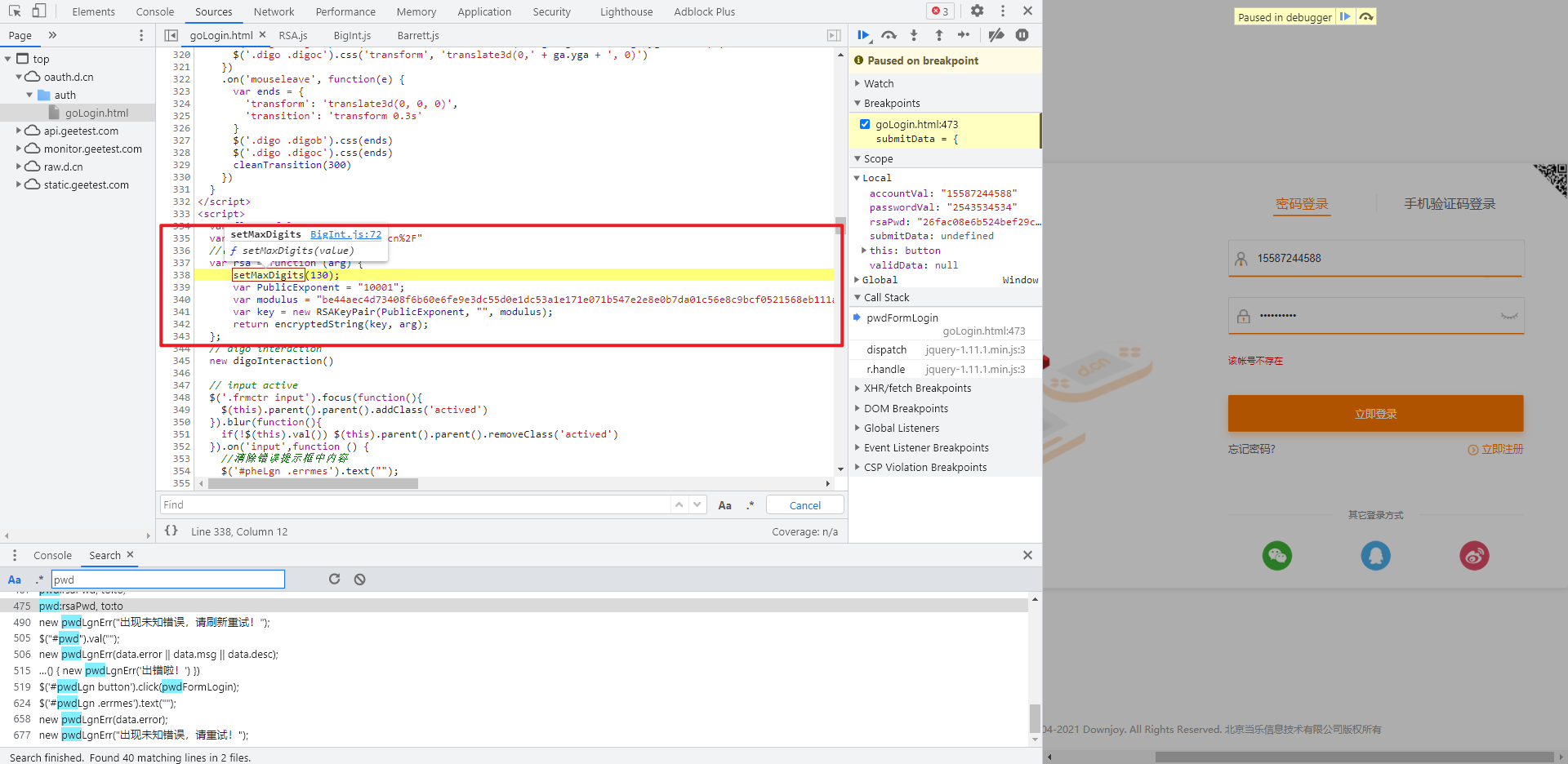 setMaxDigits 这个函数在 BigInt.js 里面可以找到,而 RSAKeyPair 和 encryptedString 都可以在 RSA.js 里面找到,由于这两个 JS 都比较复杂,所以直接将两个 JS 源码全部复制下来直接调用即可。