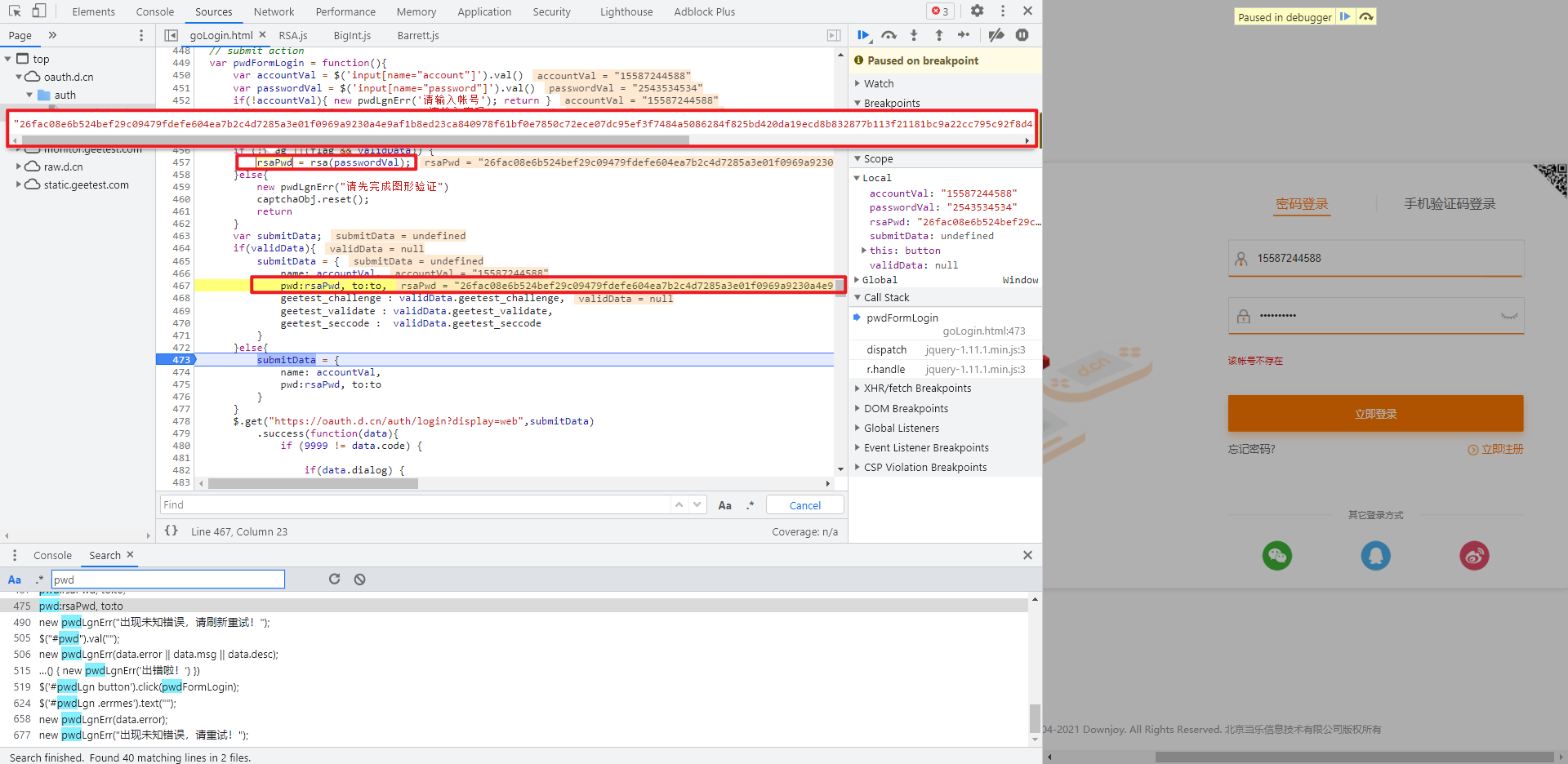 全局搜索 pwd 关键字,在首页就可以找到一段 submitData 提交数据的函数,埋下断点进行调试,可以发现明文密码是经过 RSA 加密后得到的: