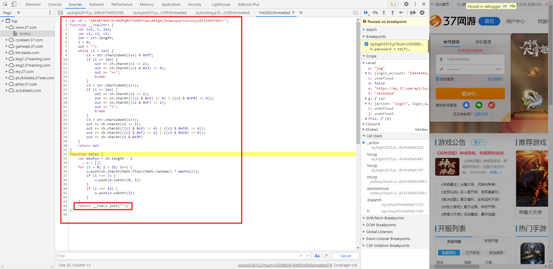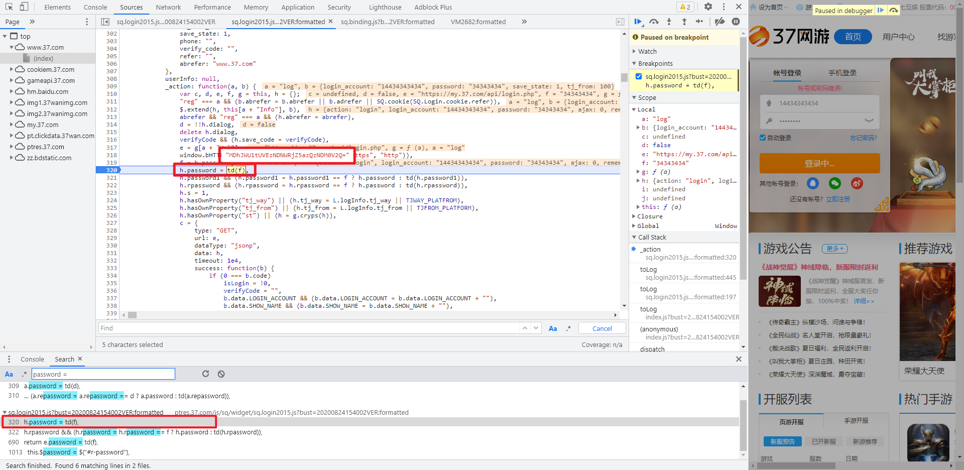 在本案例中,我们搜索 password=,在 sq.login2015.js 文件里可以看到语句 h.password = td(f),疑似密码加密的地方,在此处埋下断点进行调试,可以看到返回的值确实是加密后的密码: