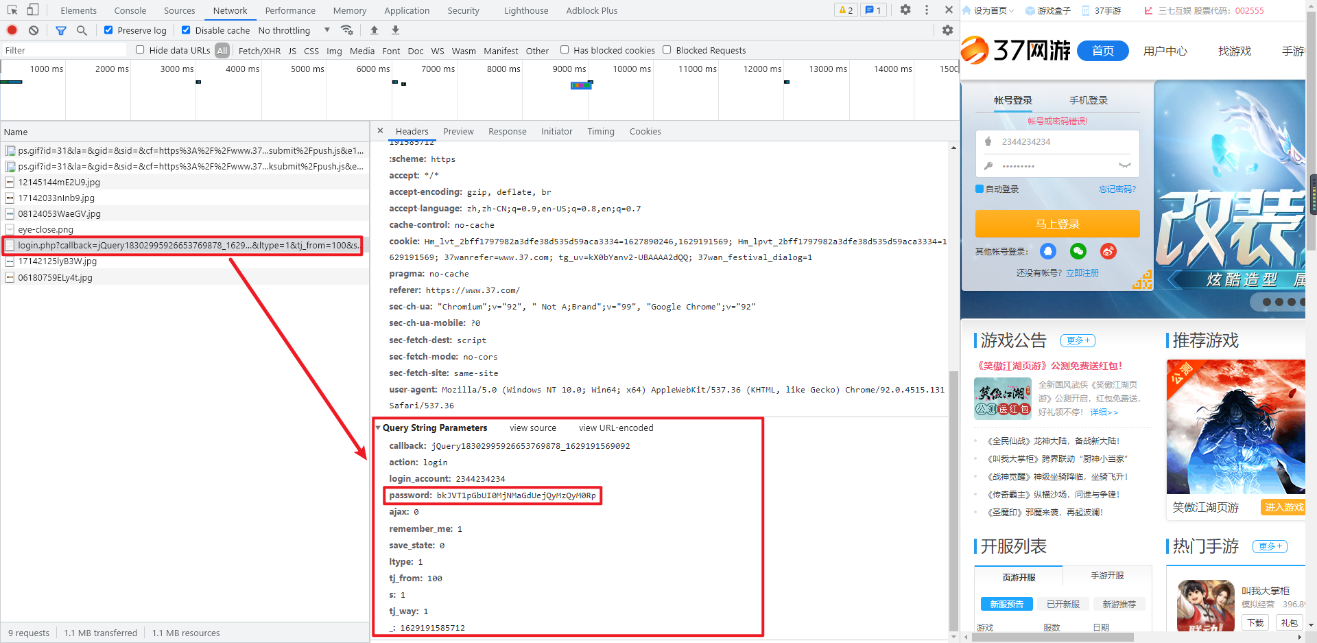 随便输入一个账号密码,点击登陆,抓包定位到登录接口为 https://my.37.com/api/login.php ,GET 请求,分析一下 Query String Parameters 里的主要参数: