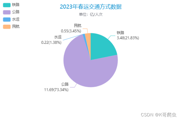 据统计:2023年春运,铁路、公路、水路、民航分别发送旅客3.48亿、11.69亿、2245.2万和5521.4万人次。