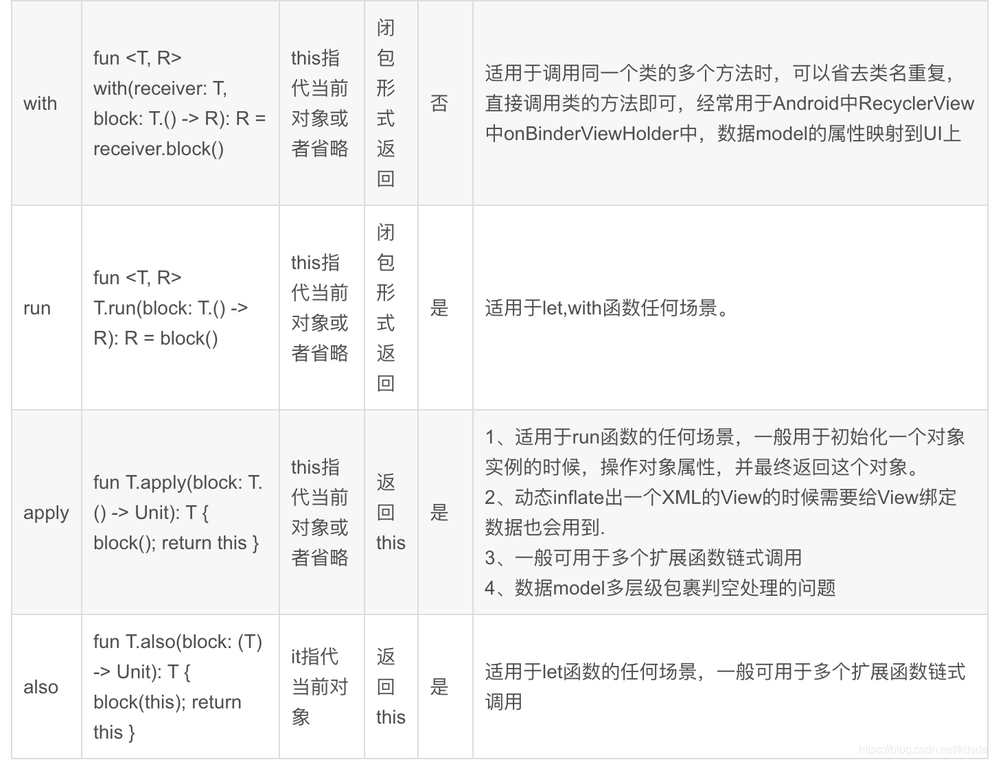 通过以上几种函数的介绍,可以很方便优化kotlin中代码编写,整体看起来几个函数的作用很相似,但是各自又存在着不同。使用的场景有相同的地方比如run函数就是let和with的结合体。下面一张表格可以清晰对比出他们的不同之处。