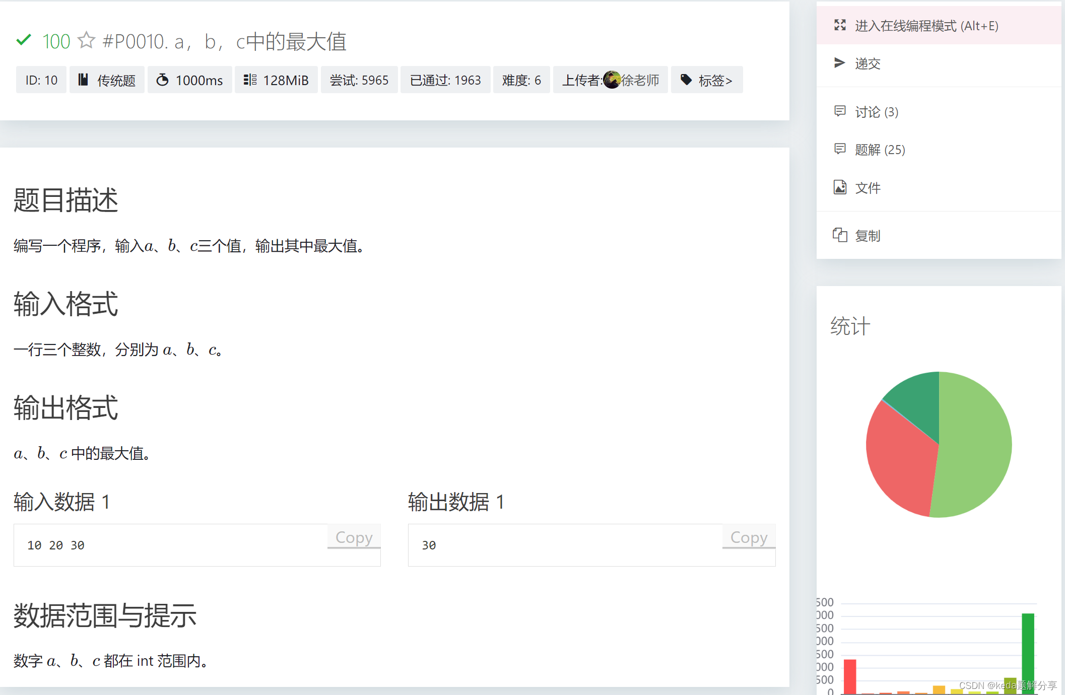 这道题也有很多解法,类似于单独比较,自定义函数,而我要教的是max函数!!!格式为max(a,b)返回值是a和b大的那个数!!!(拓展:min函数,格式为min(a,b)返回值是a和b小的那个数)