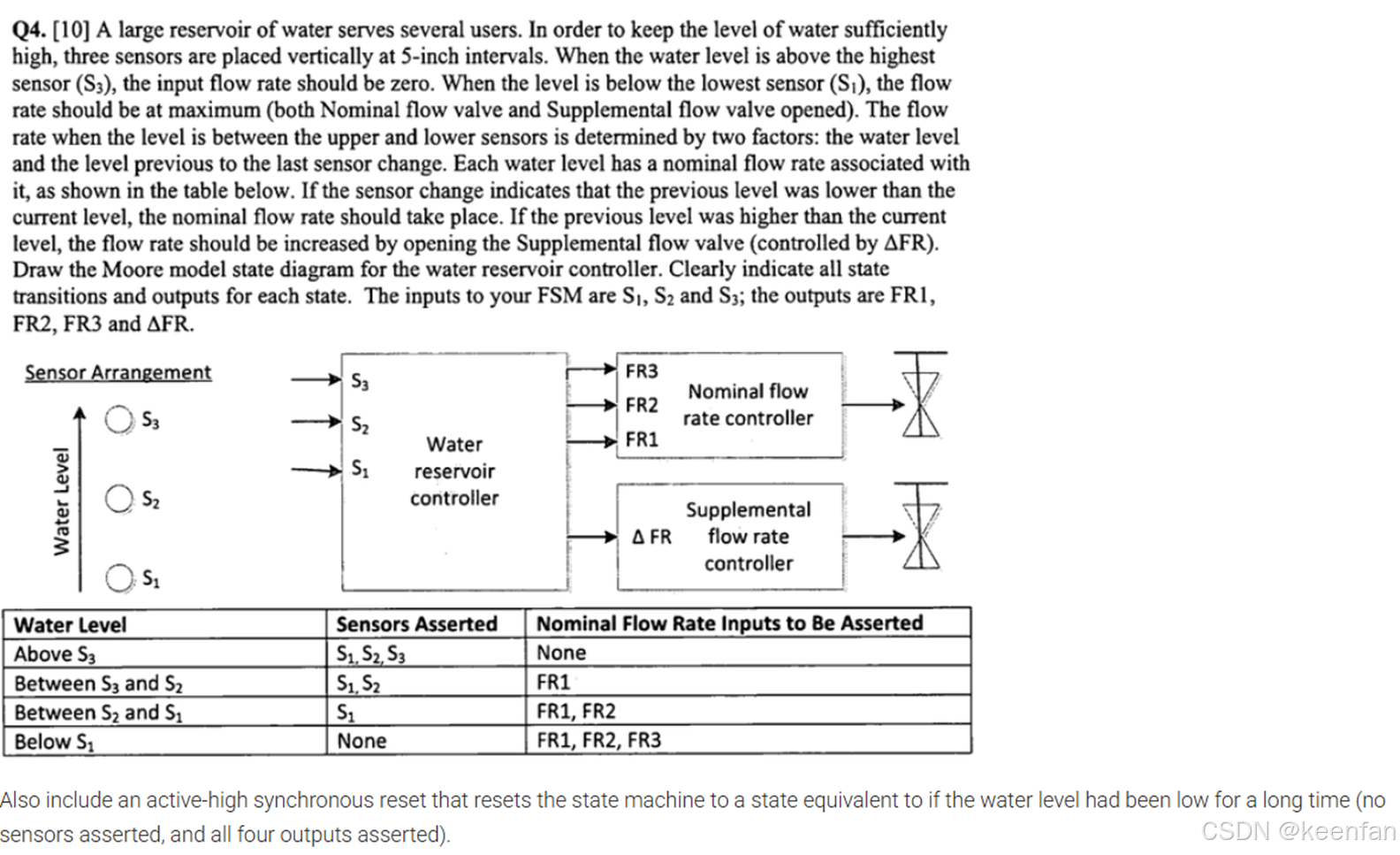 由于前几题的思维惯性,我第一步没有关注输出的四项,而是首先考虑了不同状态的变化(这也导致我后续再单独考虑输出时,思路就比较混乱)。同时,这里我也被表格一定程度误导,以三个传感器提供的输入将本题简单考虑成了四个状态lowest、s1_a、s2_a、s3_a,分别表示水位最低,水位在s1和s2之间,水位在s2和s3之间,水位在s3上方。下一步就是先写状态转换的代码。