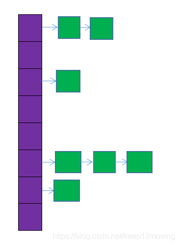 图中,紫色部分即代表哈希表,也称为哈希数组,数组的每个元素都是一个单链表的头节点,链表是用来解决冲突的,如果不同的key映射到了数组的同一位置处,就将其放入单链表中。
