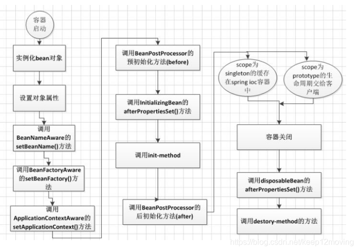 10.经过流程9之后,就可以正式使用该Bean了,对于scope为singleton的Bean,Spring的ioc容器中会缓存一份该bean的实例,而对于scope为prototype的Bean,每次被调用都会new一个新的对象,期生命周期就交给调用方管理了,不再是Spring容器进行管理了