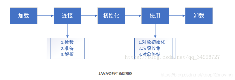 类的生命周期包括这几个部分,加载、连接、初始化、使用和卸载,其中前三部是类的加载的过程,如下图;
