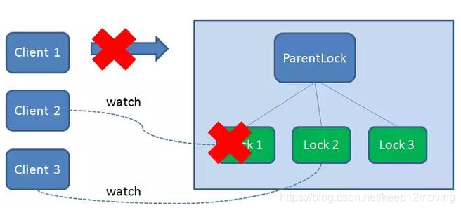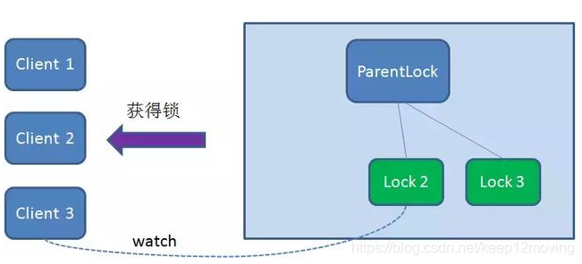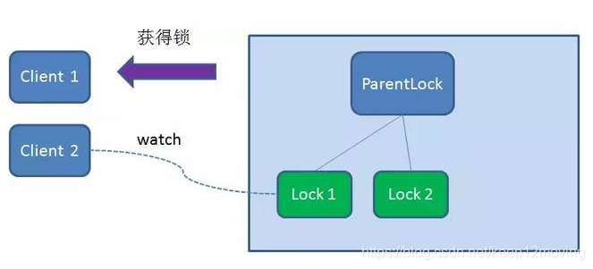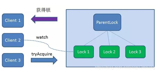 这样一来,Client1得到了锁,Client2监听了Lock1,Client3监听了Lock2。这恰恰形成了一个等待队列,很像是Java当中ReentrantLock所依赖的
