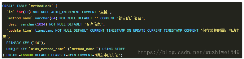 `method_name` varchar(64) NOT NULL COMMENT '锁定的方法名',