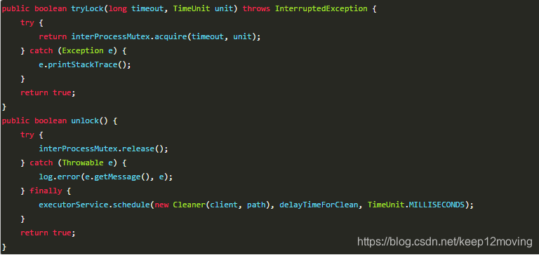 Curator提供的InterProcessMutex是分布式锁的实现。acquire方法用户获取锁,release方法用于释放锁。