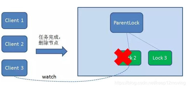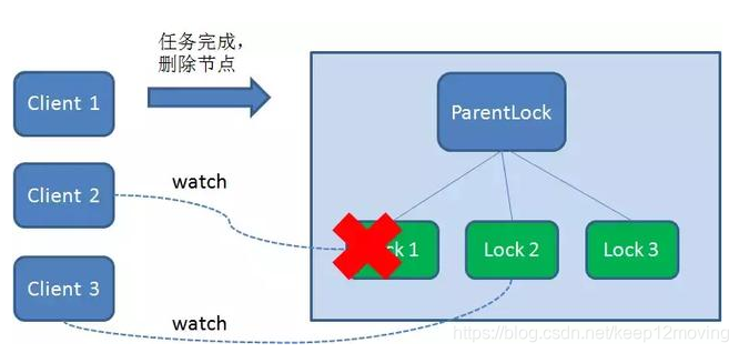 当任务完成时,Client1会显示调用删除节点Lock1的指令。