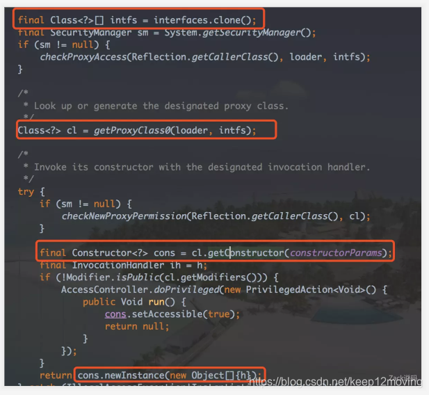 通过上面的讲解,相信大家对动态代理的使用理解得比较深刻了。那动态代理到底是怎么实现的呢,我们来看看源码其中关键的地方。