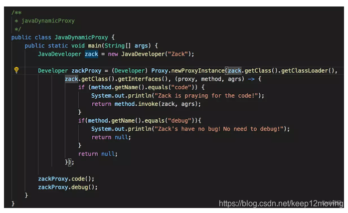 有没有留意到zackProxy的类型是Developer接口,而不是一个实现类。因为zack在被代理后生成的对象,并不属于Developer接口的任何一个实现类。但是它是基于Developer接口和zack的类加载代理出来的。
