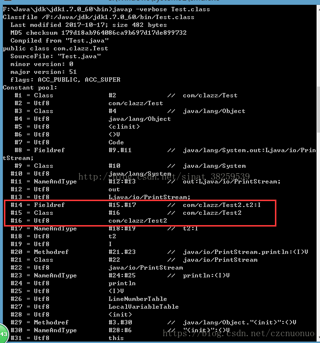 我们对javap工具打印出Test.class的常量池看一下: