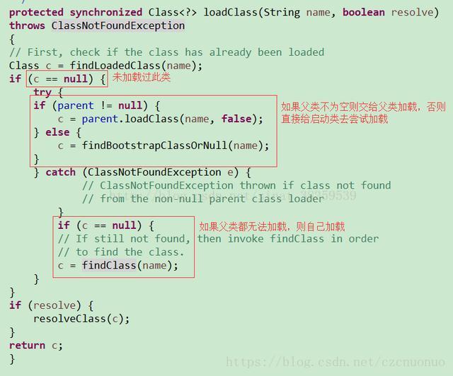 除了以上ClassLoader抽象类的一些主要方法介绍,在自己写自定义类加载器前还是非常有必要讲解一下类加载器的“双亲委派机制”。就如以上的“双亲委派机制图”所示,它的工作过程是这样的:如果一个类加载器收到了类加载的请求,它首先不会自己去尝试加载这个类,而是把这个请求委派给父类加载器去完成,每一个层次的类加载器都是如此,因此所有的加载器请求最终都是应该传送到顶层的启动类加载器中,只有当父加载器反馈自己无法完成这个加载请求(它的搜索范围中没有找到所需要的类)时,子加载器才会尝试自己去加载。如ClassLoader类的loadClass方法所示: