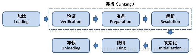 类从被加载到虚拟机内存中到卸载出内存,整个生命周期:加载、连接、初始化、使用、卸载。其中连接分为验证、准备、解析。解析的顺序不一定,有可能按照上述顺序,也有可能在初始化阶段之后才开始,这是为了支持Java的运行时绑定(动态绑定)。如下图直观展示: