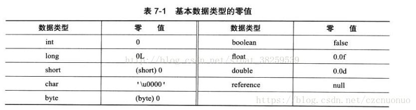 那变量value在准备阶段过后的初始化值为0而不是123,因为这是尚未开始执行任何Java方法,而把value赋值为123的putstatic指令是程序被编译后存放在类构造器<clinit>()方法之中,所以把value赋值为123的动作将在初始化阶段才会执行。以下表格列出了所有基本数据类型的零值: