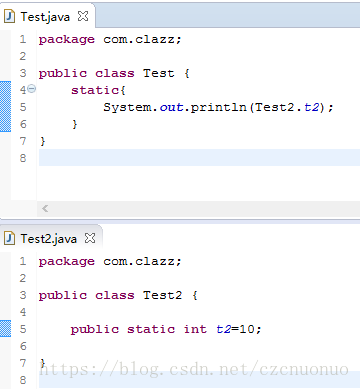 ■<clinit>()方法是有编译器自动收集类中的所有类变量的赋值动作和静态语句块(static{}块)中的语句合并产生的,编译器收集的顺序是有语句在源文件中出现的顺序所决定的,静态语句块中只能访问到定义在静态语句之前的变量,定义在它之后的变量,在前面的静态语句块可以赋值,但不能访问,如下例子所示:
