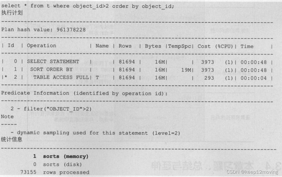 查看该sql是否排序,此处说明在内存中排序,并未到磁盘中排序。排序动作在CPU性能上开销较大,如果PGA区(内存)无法容纳下排序的尺寸,而进入磁盘排序,那将成为更大的性能杀手。